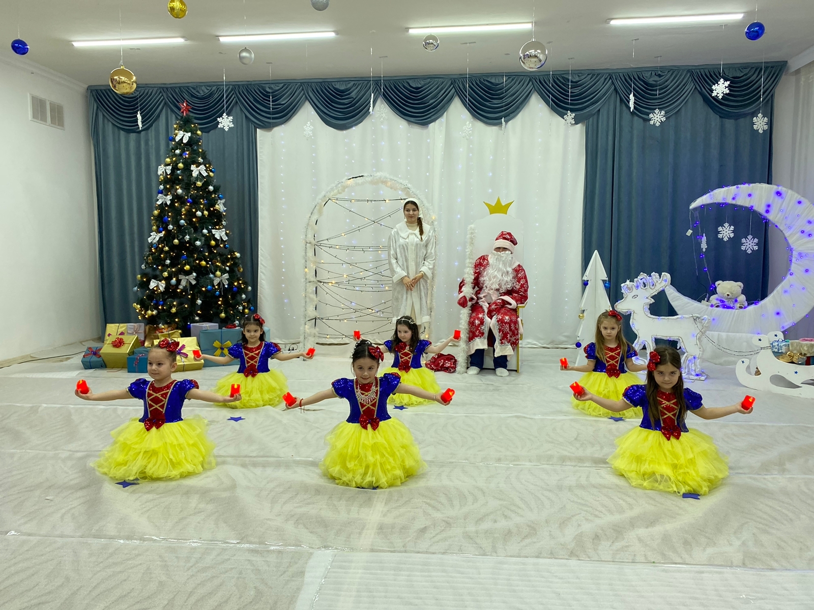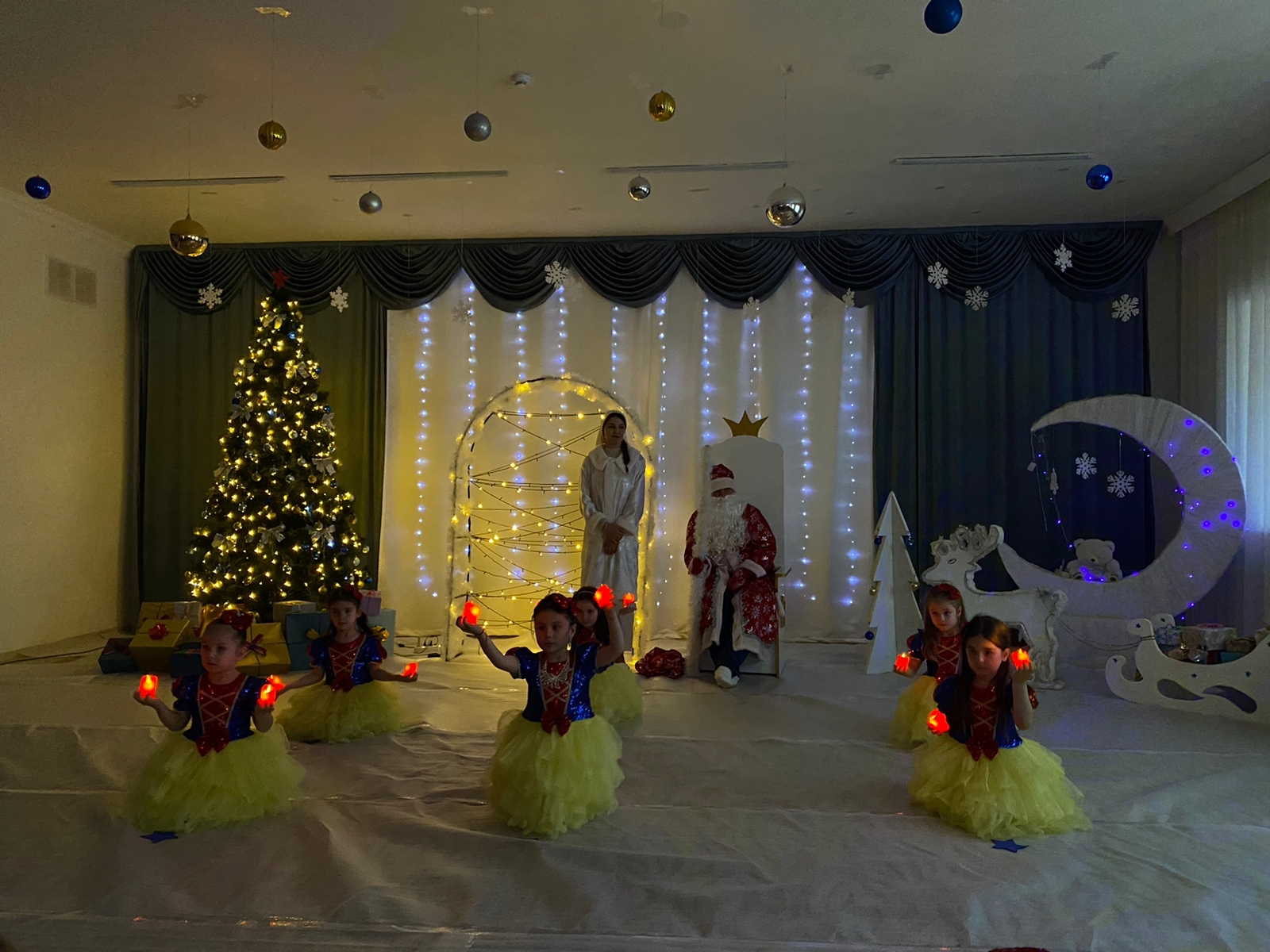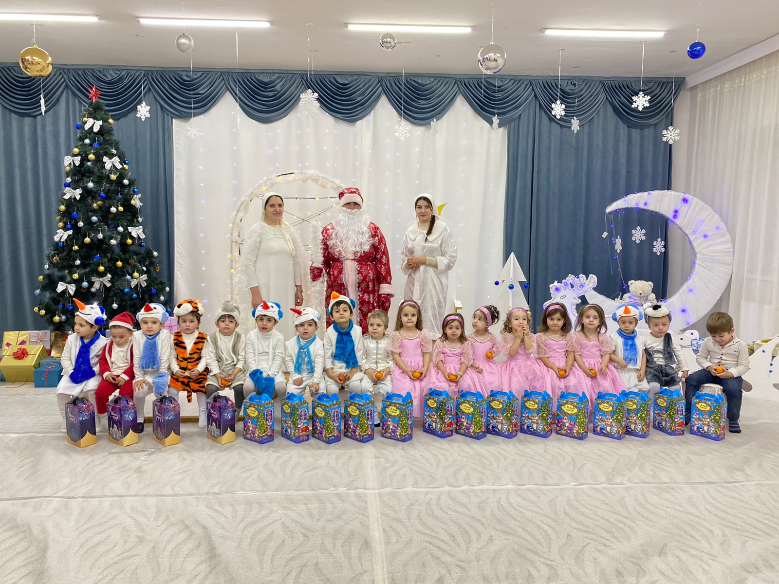 Красиво украшенный зал, нарядная елка, великолепные костюмы, подарки, Дед Мороз, Снегурочка и множество других сказочных персонажей ожидали детей и сотрудников детского сада. Радостной и незабываемой для детей была встреча со сверкающей огнями елочкой.
