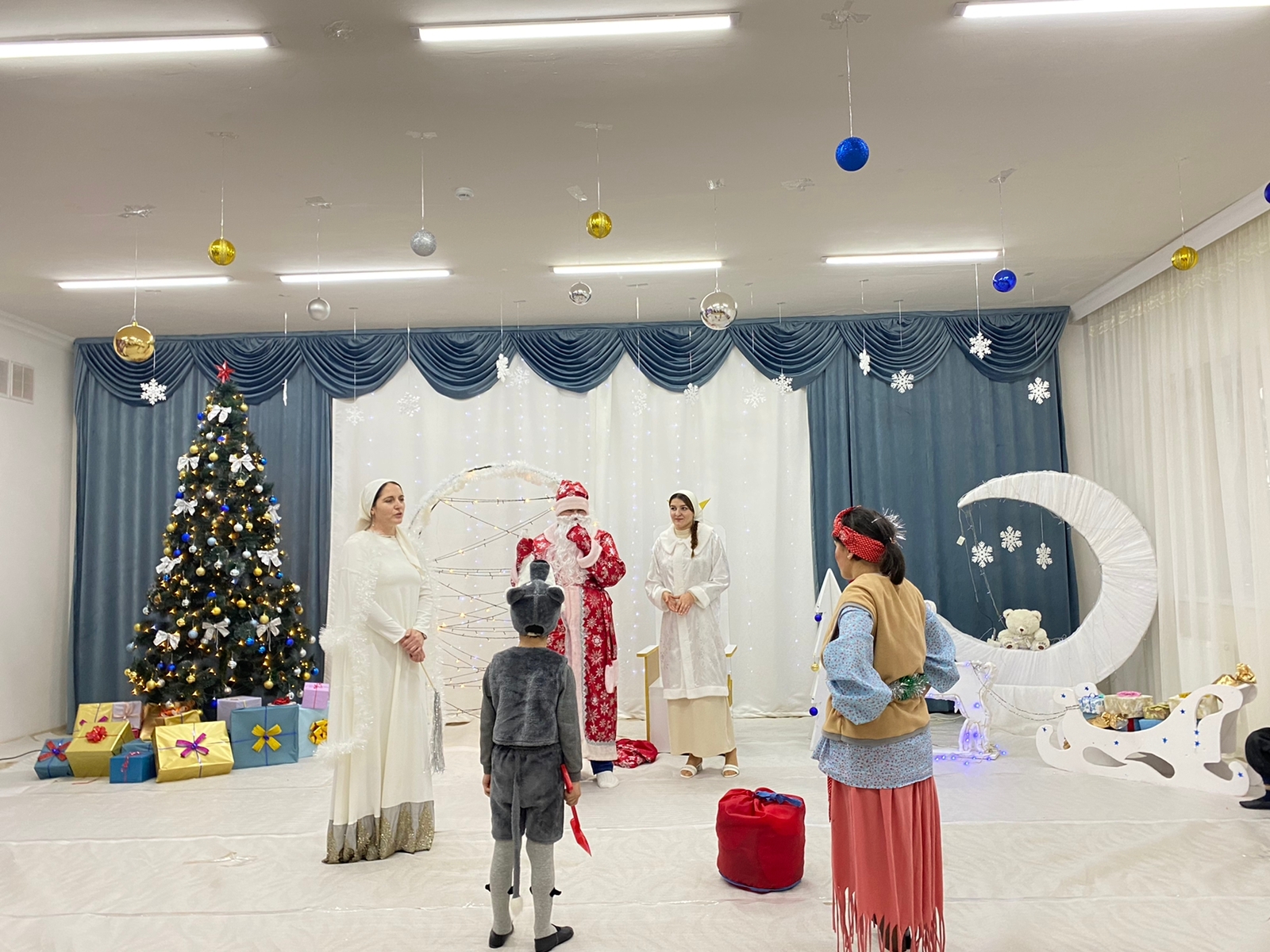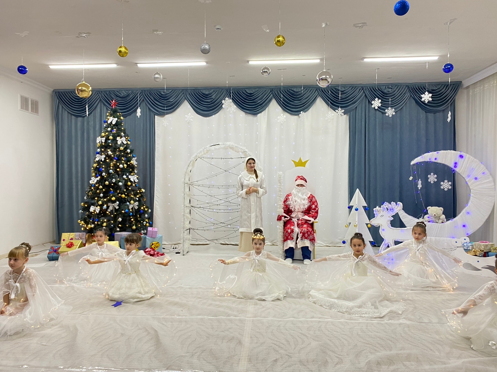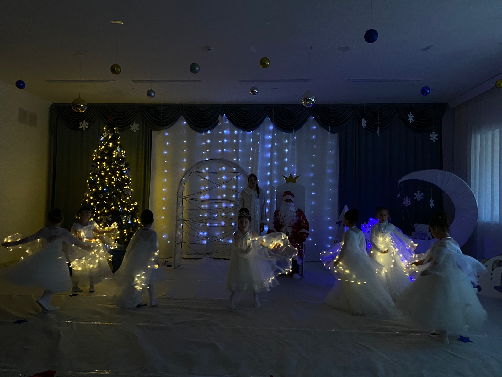 Красиво украшенный зал, нарядная елка, великолепные костюмы, подарки, Дед Мороз, Снегурочка и множество других сказочных персонажей ожидали детей и сотрудников детского сада. Радостной и незабываемой для детей была встреча со сверкающей огнями елочкой.